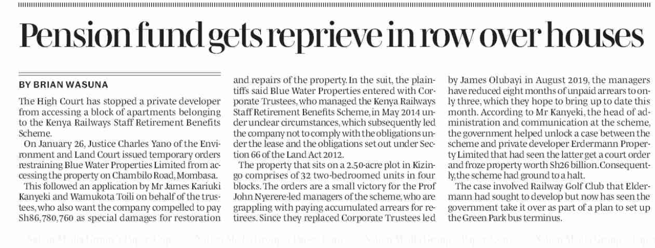 The high court has stopped a private developer from accessing a block of apartments belonging to the Kenya Railways Staff Retirement Benefits Scheme. On January 26, Justice Charles Yano of the Environment and Land Court issued temporary orders restraining Blue Water Properties Limited from accessing the property on Chambilo Road, Mombasa. This followed an application by Mr James Kanyeki and Wamukota Toili on behalf of the trustees, who also want the company compelled to pay Sh 86,780,760 as special damages for restoration and repairs of the property.